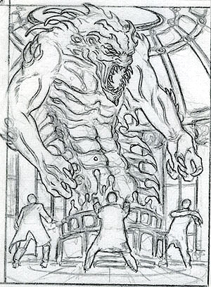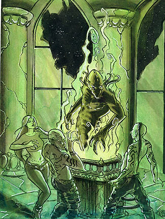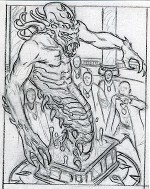 Studies for the cover of one of D:TF’s suppliments. For reasons unknown to me at the time, the emphasis was meant to be on the summoners and not the demon. The idea was that each of the summoners was to look vaguely like a known celebrity. This was I suppose meant to suggest the real (W.O.D) reason why so many of the least talented or deserving individuals make the limelight. No doubt, someone will eventually have the brainstorm to cut out the middle man and start giving The Fallen their 15 minutes.